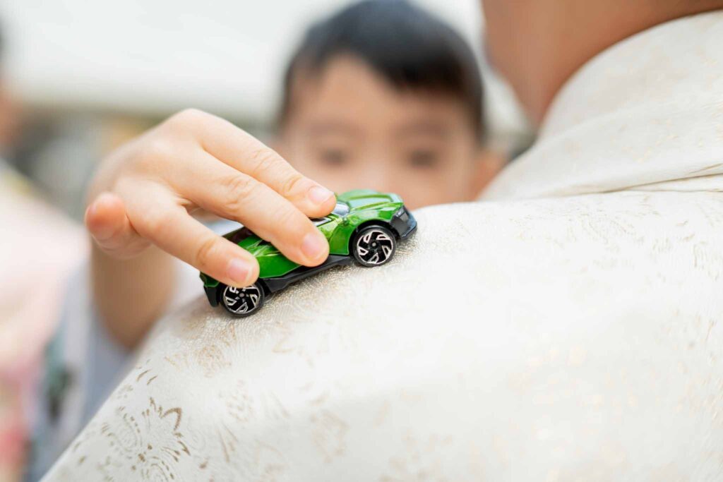 パパの肩でミニカー走らす